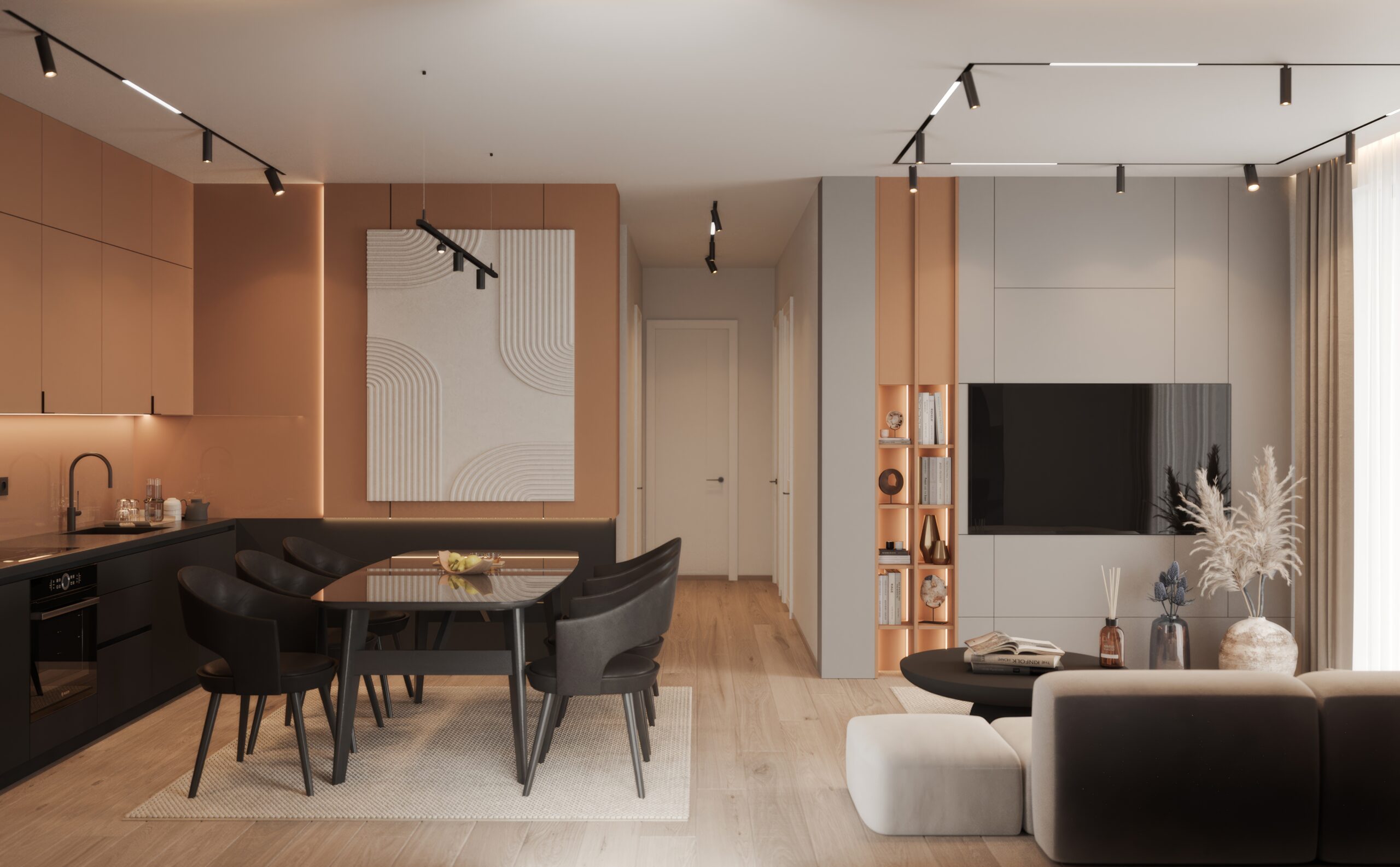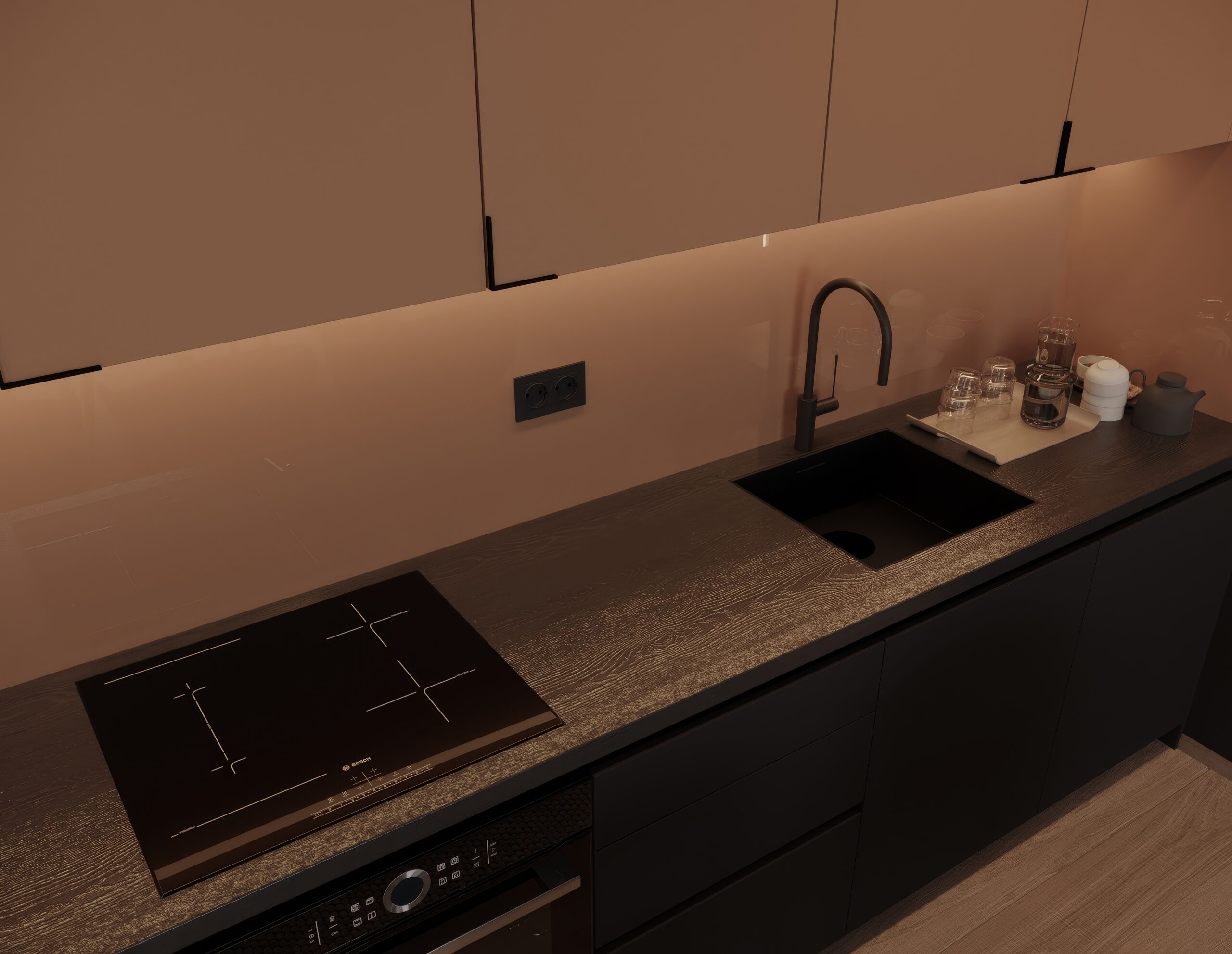 • Sunčani akcent: elegantna radna površina u svetlom drvetu obogaćena je diskretnim narandžastim elementima koji razbijaju neutralnu paletu zida.