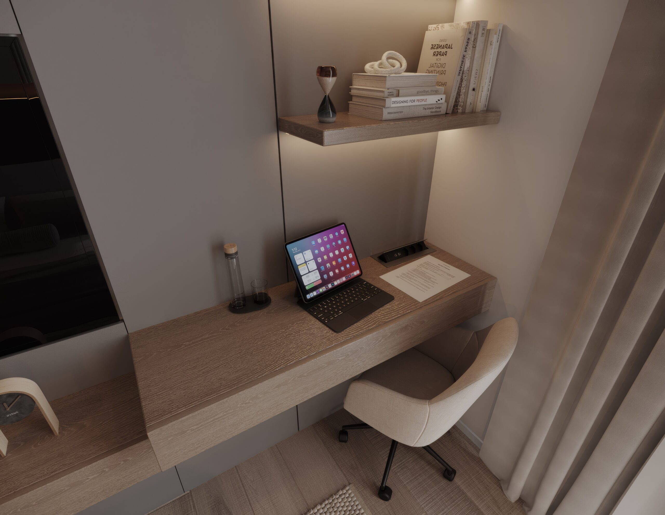 • Ambijentalna rasveta: LED traka ispod police i usmerena stona lampa stvaraju savršenu atmosferu za fokusiran rad ili opuštenu čitanje.